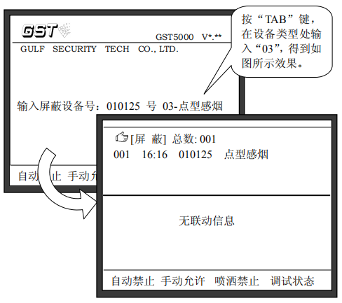 注意:在進(jìn)行消防主機(jī)“屏蔽”操作中輸入設(shè)備的編碼時(shí),可以使用通配符“*”,“*”代表這一位可以是0~9中的任意一個(gè)數(shù)字,這個(gè)功能可以方便的將一類設(shè)備取消屏蔽。例如:如果要屏蔽掉系統(tǒng)中所有的點(diǎn)型感煙火災(zāi)探測器,我們可以在屏蔽操作時(shí)輸入:“******”,“TAB”,“03”,這樣所有點(diǎn)型感煙火災(zāi)探測器將被屏蔽。其中“03”為點(diǎn)型感煙火災(zāi)探測器設(shè)備類型代碼。