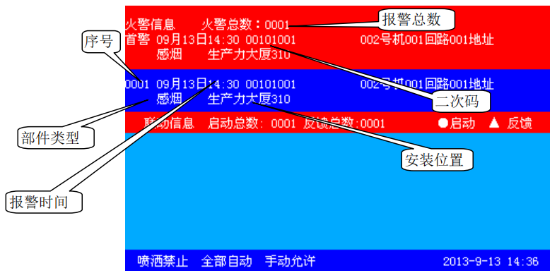 控制器經(jīng)確認(rèn)后進(jìn)入火災(zāi)報(bào)警狀態(tài)并發(fā)出火警聲、光警報(bào)。此時(shí)面板上紅色火警指示燈常亮,液晶屏上顯示火警序號(hào)、火警總數(shù)、首警部位、報(bào)警部件的編碼及類型、報(bào)警時(shí)間、安裝位置等信息(詳見圖上半屏顯示),同時(shí)打印機(jī)、歷史記錄記錄相關(guān)火警信息。當(dāng)火警數(shù)量超過兩條顯示時(shí),除首警外,其余報(bào)警可自動(dòng)循環(huán)顯示,按鍵盤上的“▲”、“▼”鍵也可手動(dòng)查詢。
